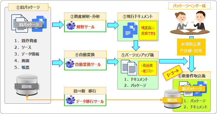 旧技術で作られていたパッケージ資産は新言語での刷新(リノベーション)、新OS対応などバージョンアップが必要です。