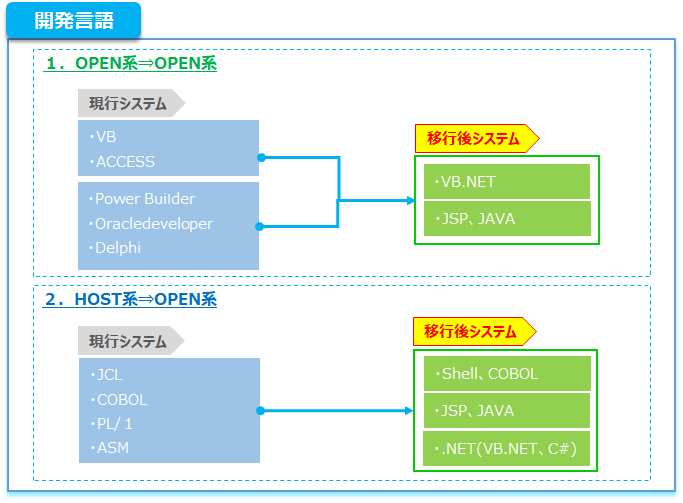 旧技術で作られていた現行システム資産を新言語、新OSに対応させ革新された新システムに変換致します。